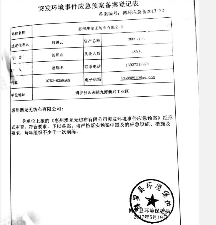 已制订《168飞艇开奖官网直播记录突发环境事件应急预案》,并于2017年 5月19日在博罗县环境保护局备案, |